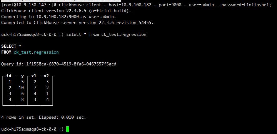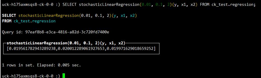 #### 1)前面我们说过,Clickhouse也可用于搭建机器学习模型。这里我们用二)中的regression表跑一下线性回归算法。请使用clickhouse或者clickhouse-driver登录数仓后,并运行如下命令。