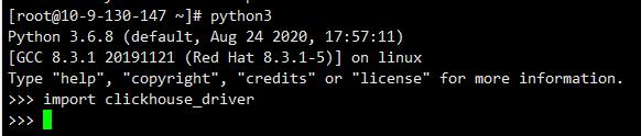##### 2.1)安装完毕后运行python3,然后import clickhouse_driver,若没有报错,则说明clickhouse_driver安装成功。