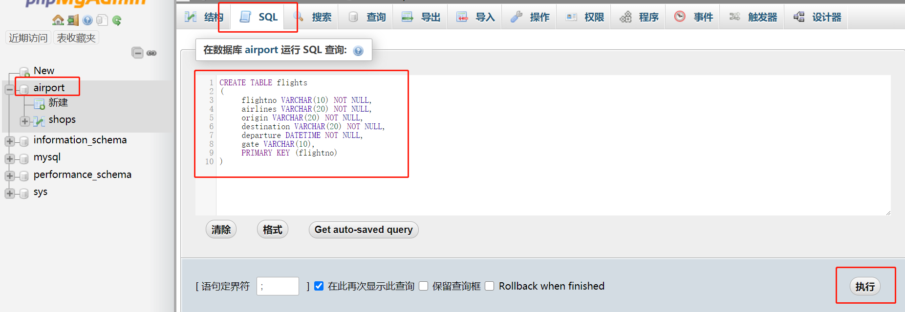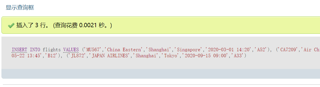 **************作业3:请将执行 SELECT * FROM flights 语句后的页面截图,并插入实验报告***************