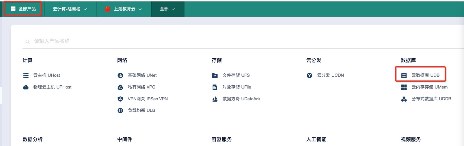 云数据库UDB、云主机uhost、基础网络unet