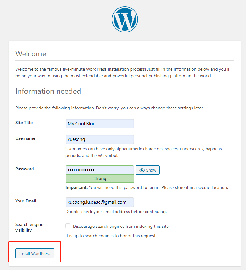 WORDPRESS_DB_HOST是要连接的数据库ip和端口,WORDPRESS_DB_USER是数据库登录名,WORDPRESS_DB_PASSWORD是登陆密码,请设置为你的数据库信息。