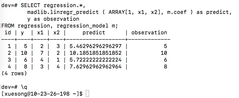 这里我们看到使用了MADlib的线性回归模型linregr_train来对regression表中的数据进行训练,模型输入变量为x1, x2以及偏置项,输出变量为y。训练好的模型保存在regression_model表中。
