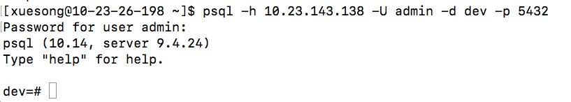 conn = psycopg2.connect(database="dev", user="username", password="password", host="hostIP", port="port")