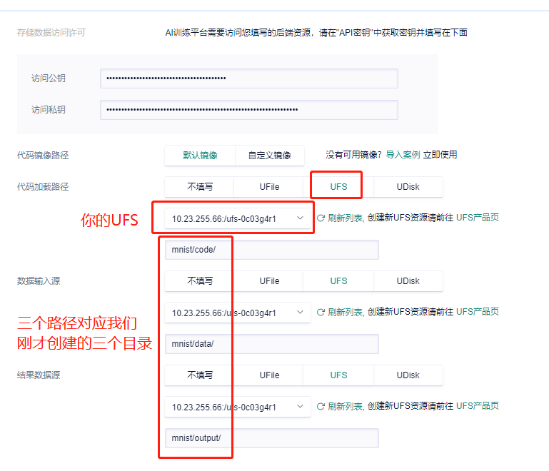 (重要!!)简要说明一下交互式训练的工作原理:启动任务的时候,UAI Train会运行一个docker容器,可以是UCloud的默认镜像,也可以是你自己创建的镜像,默认镜像已经安装了python,pytorch,tensorflow等等工具。我们配置的上述UFS路径,UAI Train会将他们映射到容器的/data目录下。也就是说,mnist/data会映射到容器的/data/data目录,mnist/code会映射到容器的/data/code目录。接下来我们便可以在容器中访问这些路径,运行代码。