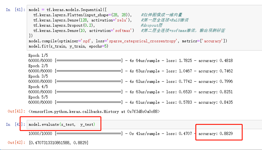 **************作业5:上述代码训练的模型,在测试集上精度较低(如下图),请把测试集上的精度提升到95%以上(即运行model.evaluate(x_test, y_test)后,accurray在95%以上),将运行结果截图并插入实验报告***************