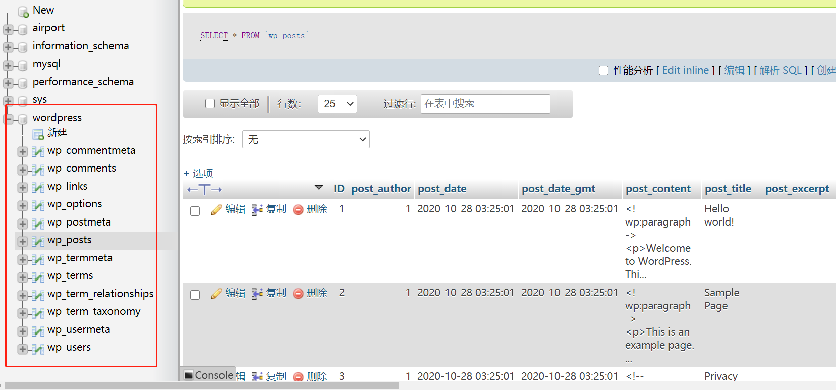 wordpress自动创建了一个数据库,并添加了若干数据表,存储博客网站的数据