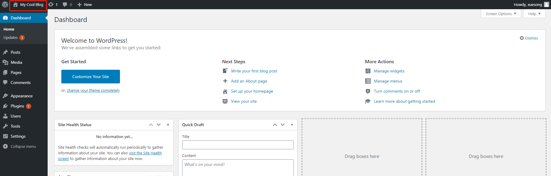 登录后进入dashboard,可以对你的博客网站进行定制。点击左上角你设定的网站名,可以进入博客主页(哇。。。界面属实有点拉垮)。
