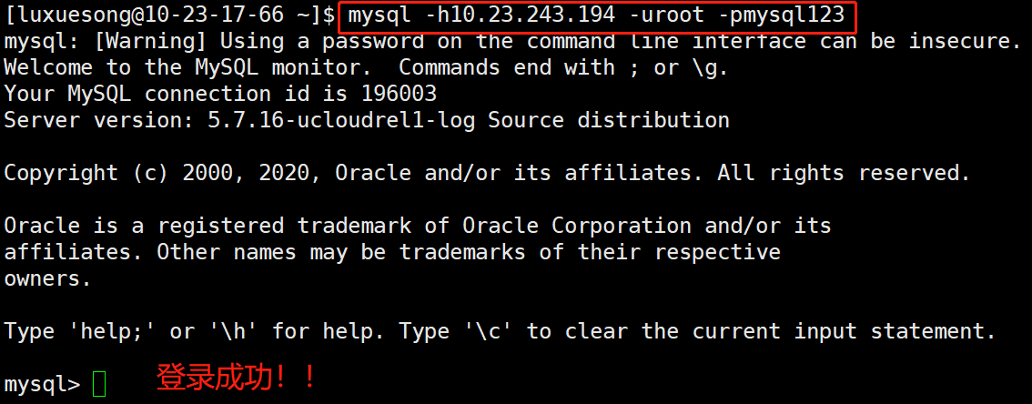b)登录刚刚创建的数据库。其中,h表示host,即数据库的ip地址;P表示端口,数据库使用默认端口可省略;u表示登录数据库的username;p表示该username的登录密码