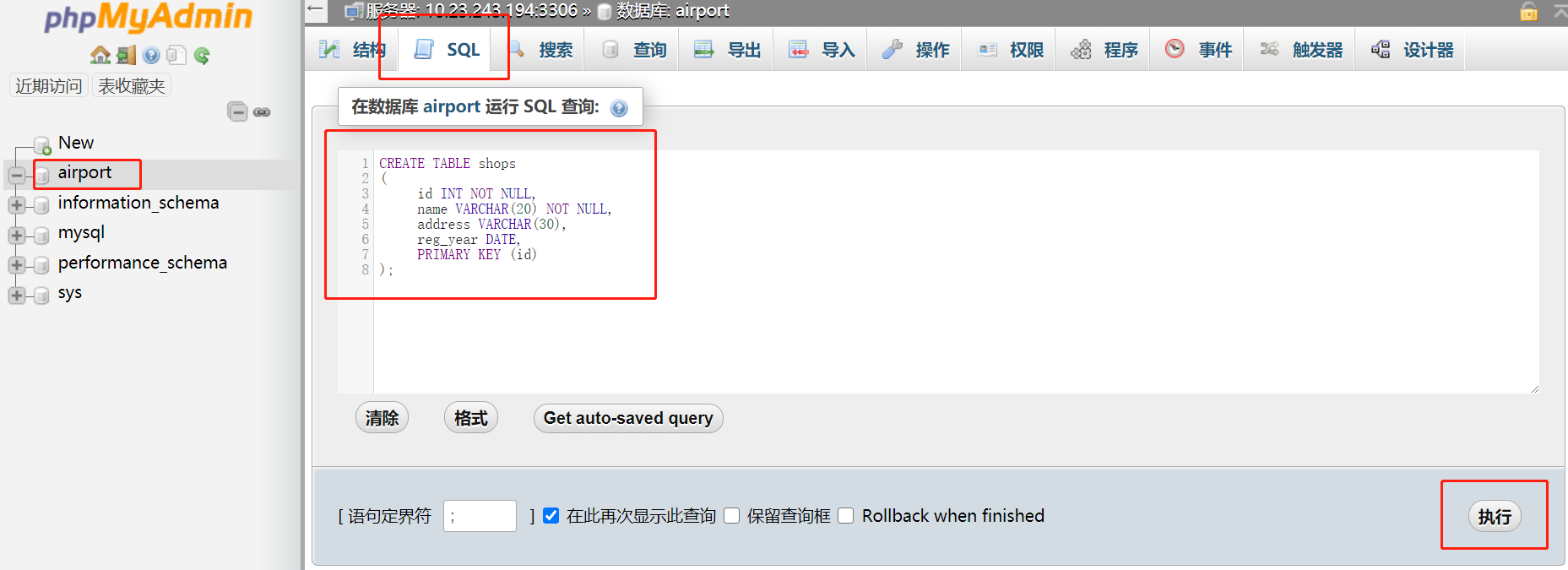 3)在表中插入一些数据。在刚才建表的窗口执行以下SQL语句。