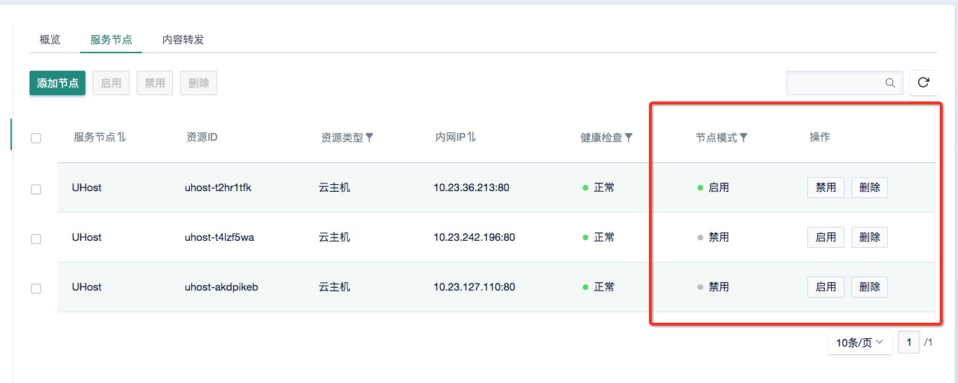 3)现在让我们把这三个云主机连接到负载均衡器,并且从负载均衡器中删除刚才的具有外网ip的节点(接下来我们要用外网ip节点做压测)。首先我们禁用掉其中的两个节点,只保留一个节点在启用状态。如下图所示。