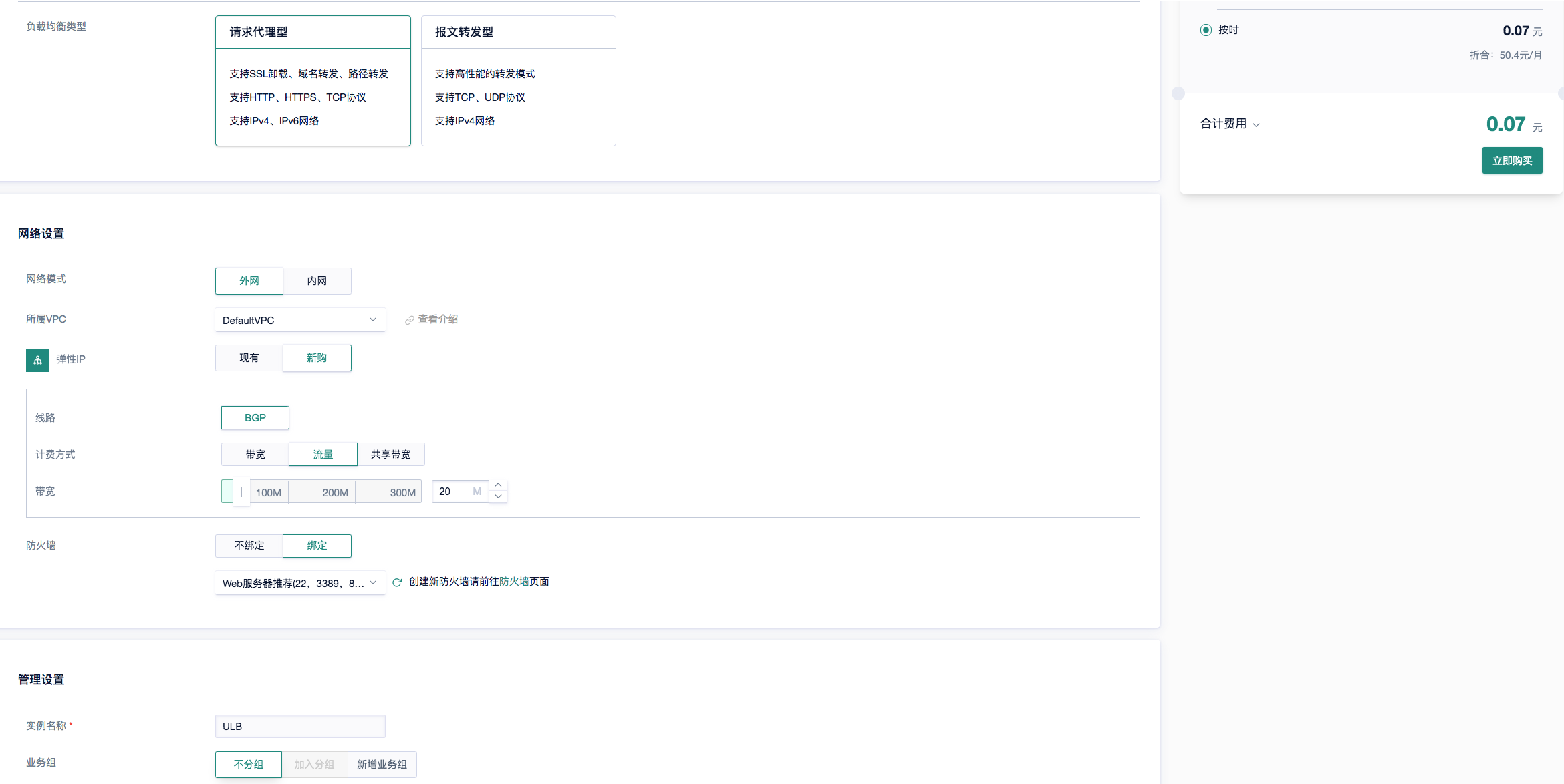 2)根据下图配置,选择按时付费。因为我们一会需要从外网访问Flask App,所以选择外网负载均衡。后面涉及默认开放端口5000,请配置开放此端口的防火墙。