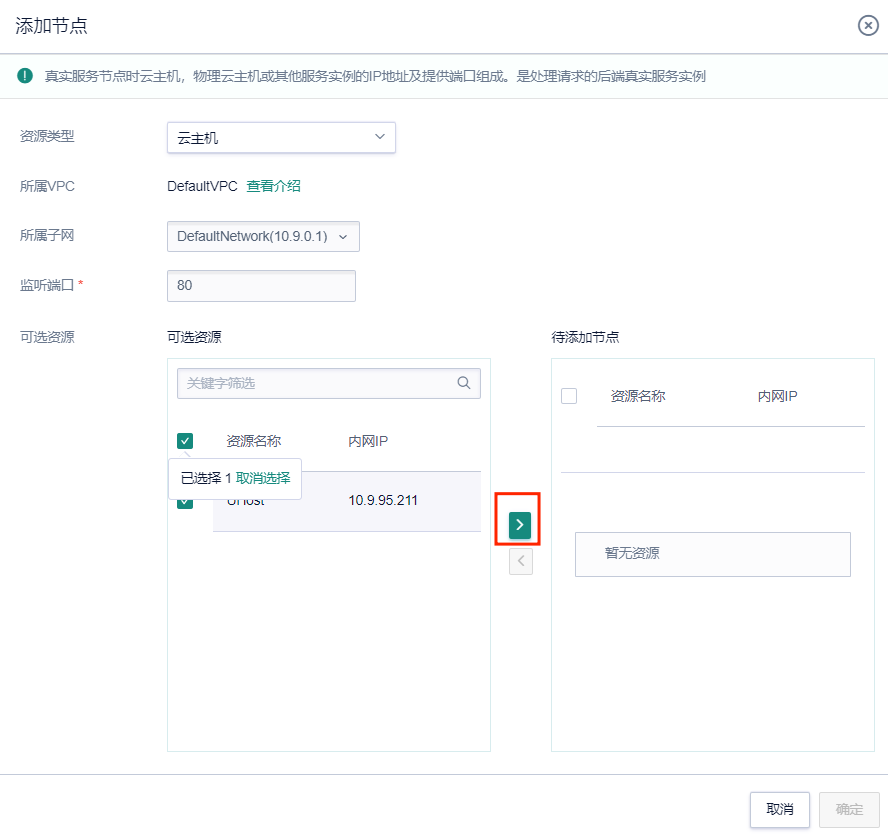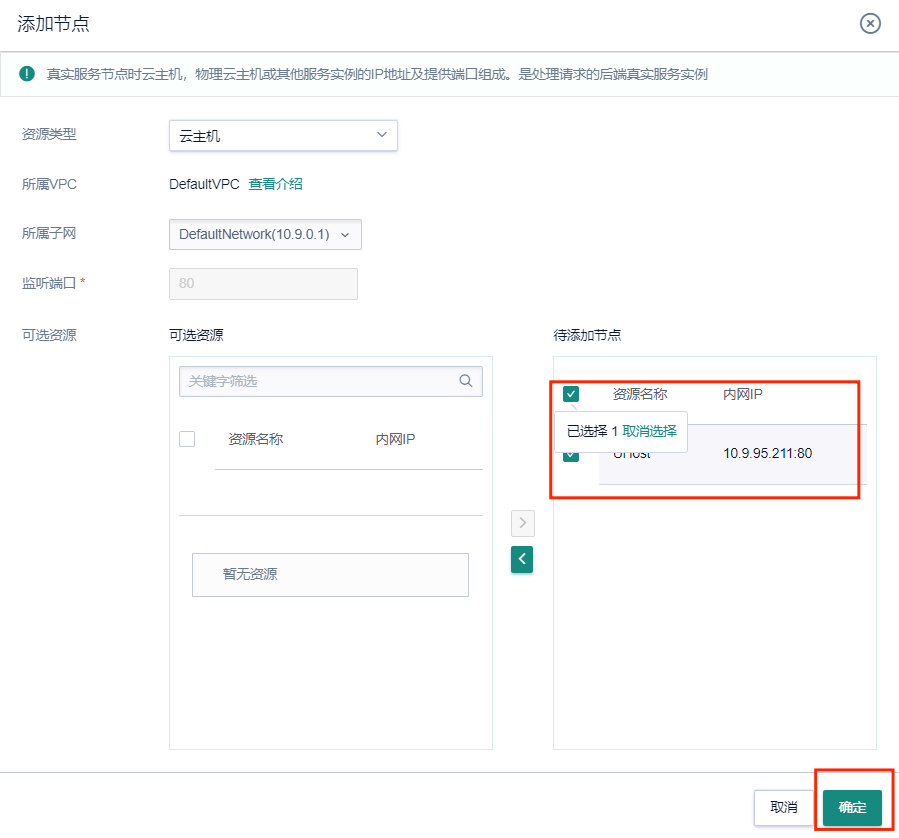 4)将云主机连到负载均衡器。回到前面添加服务节点的界面,输入端口80,则所有可添加的节点都会出现(以内网ip形式)。将你的云主机对应的内网ip,转移到待添加节点,点击确定。这时候显示健康检查“失败”,不用管它,我们在浏览器中输入 http://你的负载均衡器ip,奇迹发生了!我们也能访问flask app!!并且这时候健康检查也变成“正常”。