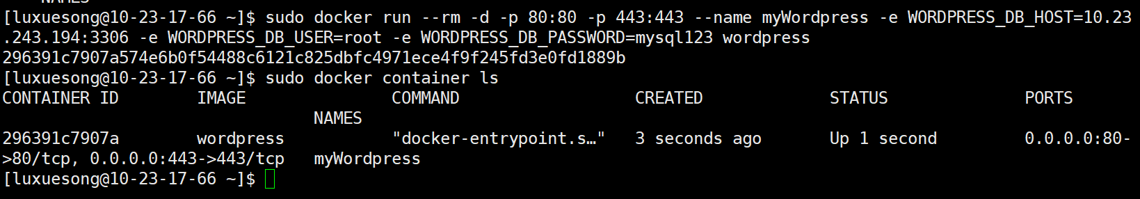 sudo docker run --rm -d -p 80:80 -p 443:443 --name myWordpress -e WORDPRESS_DB_HOST=10.23.243.194:3306 -e WORDPRESS_DB_USER=root -e WORDPRESS_DB_PASSWORD=mysql123 wordpress