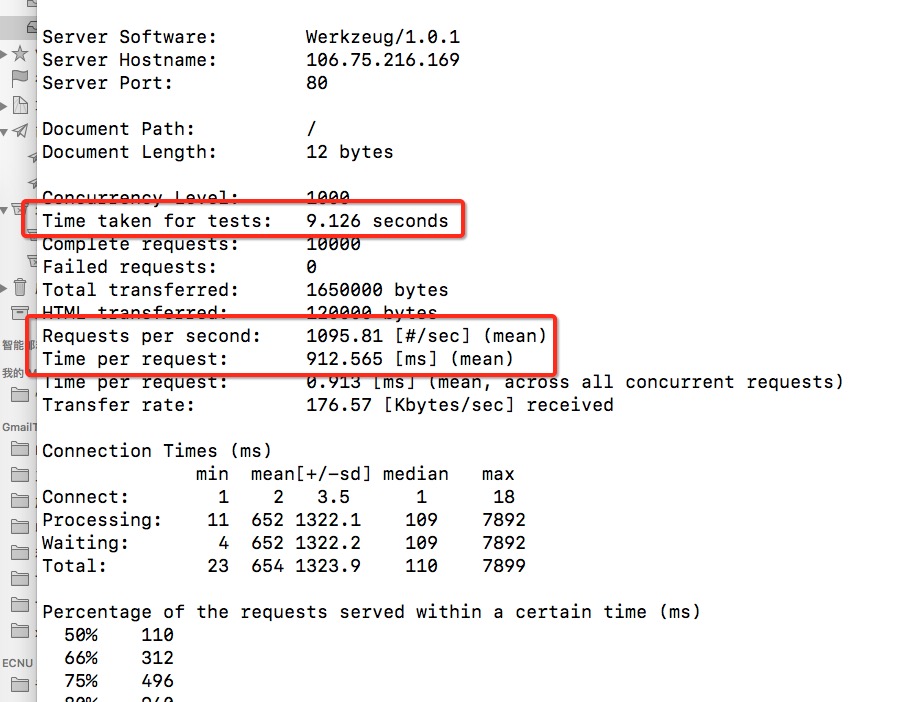 替换成你的负载均衡器ip。所以这里对我们的flask app并发1000个请求,总共发出10000个请求。结果如下图所示。ab -c 1000 -n 10000 http://106.75.216.169/