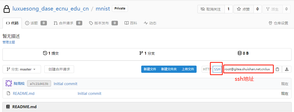 git pull root@gitea.shuishan.net.cn:luxuesong_dase_ecnu_edu_cn/mnist.git   //将pull后面的内容替换成你仓库的ssh地址