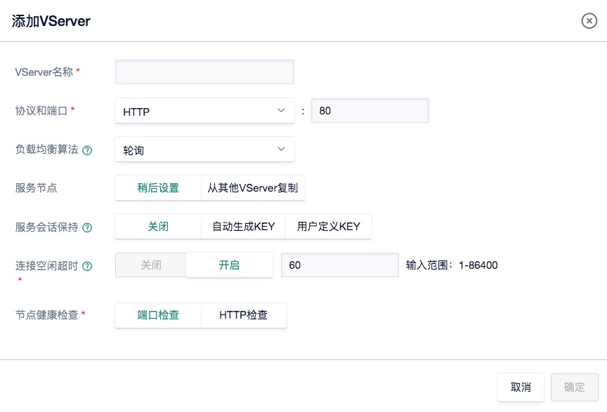3)创建完毕后,记住ULB的IP地址,点击详情->VServer管理->添加VServer。这里VServer就可以看成是一个负载均衡服务器,负责分流。取任意VServer名称,其他保持默认设置,点击确定。